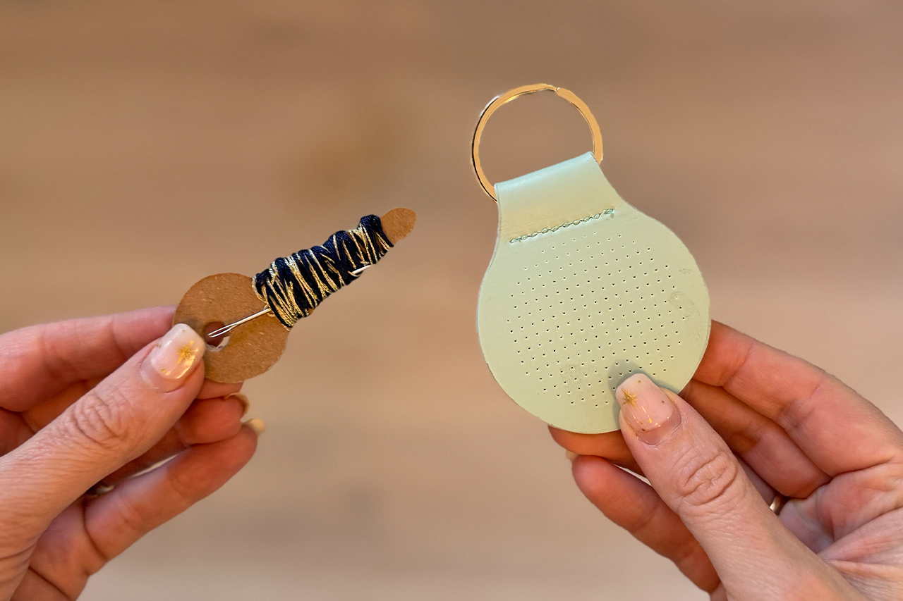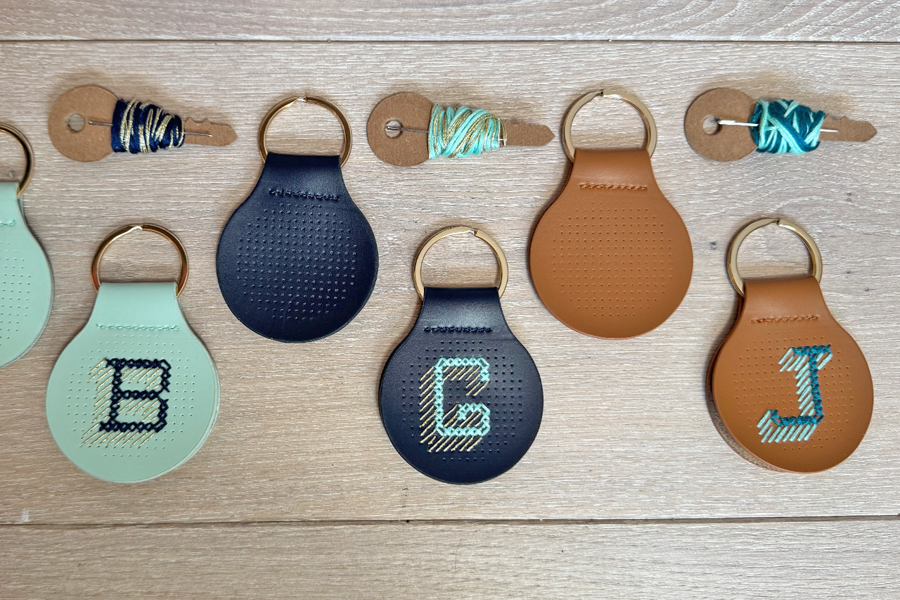 The beautiful mint keyring is specially perforated so it’s a blank canvas to be cross-stitched with a 3D letter. It comes with 2 colour threads and needle (on a cute key-shaped thread board!).